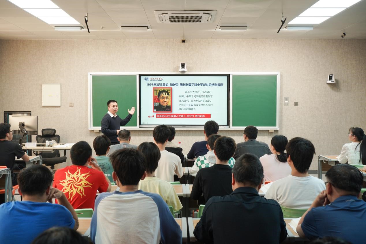 在前期教研室集体备课、充分研讨的基础上,5月3日,“概论”教研室钟立华博士以“邓小平理论的历史地位”为题,通过智慧教室在线直播方式,为全校472名学生开启“名嘴”试讲,同时有9名教师现场观摩学习。钟立华以“只有社会主义才能救中国,中国定不负社会主义”为主线,引经据典、深入浅出地讲述了邓小平理论是对马克思列宁主义、毛泽东思想的继承和发展,是中国特色社会主义理论体系的开篇之作,是改革开放和社会主义现代化建设科学指南的理论与现实依据。