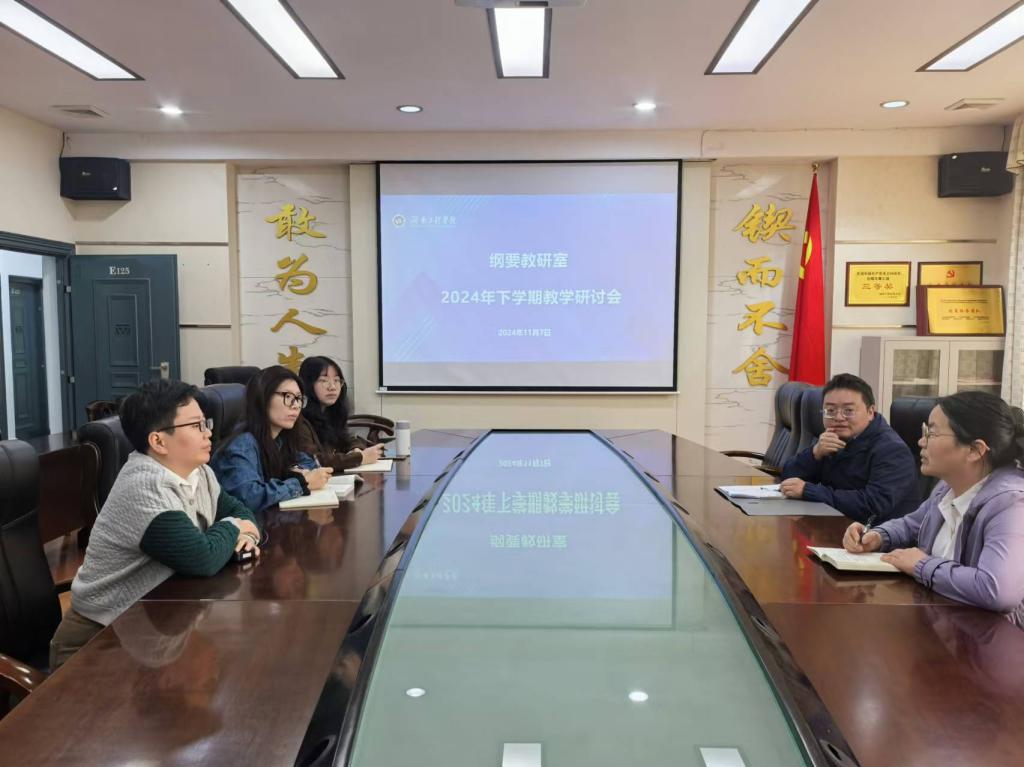 为进一步加强本科教育教学质量建设,提高教师队伍的专业水平与教学能力,11月7日海角首页社网页版登录入口纲要教研室在E125室举办了2024年下学期教学研讨会。教研室主任田小玲主持会议。本次会议以“深化教育改革,迎接本科教学评估”为主题,学院教学副院长汤菊平、纲要教研室全体教师参会。