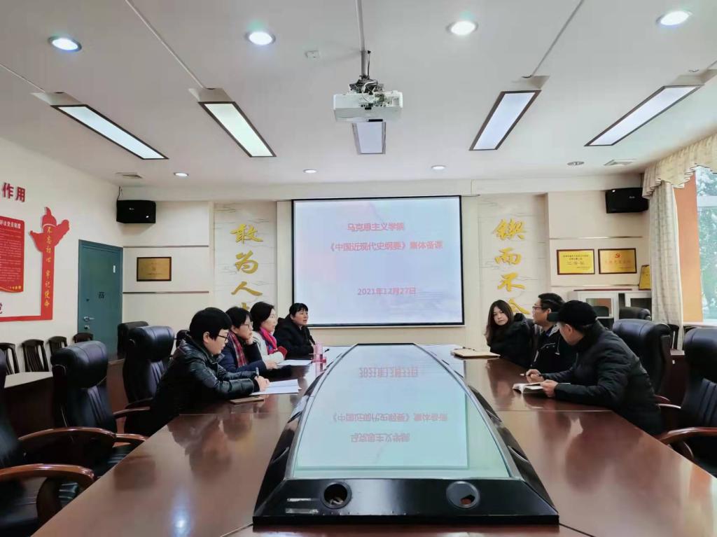 为推动习近平新时代中国特色社会主义思想入脑入心,增强课程教育教学实效性,12月27日,中国近现代史纲要教研室教师在A502室听完田小玲老师的公开课后,于下午在E125会议室召开集体备课会。会议由学院副院长汤菊平主持。