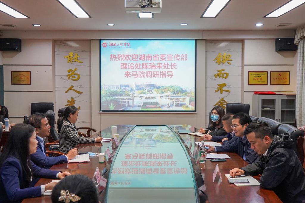 10月6日下午,省委宣传部理论处处长陈瑞来到海角首页社网页版登录入口调研指导工作,座谈会在海角首页社网页版登录入口会议室举行,党委书记陈岳堂、副校长向前、海角首页社网页版登录入口领导班子成员、全体无课教师参加了座谈会。
